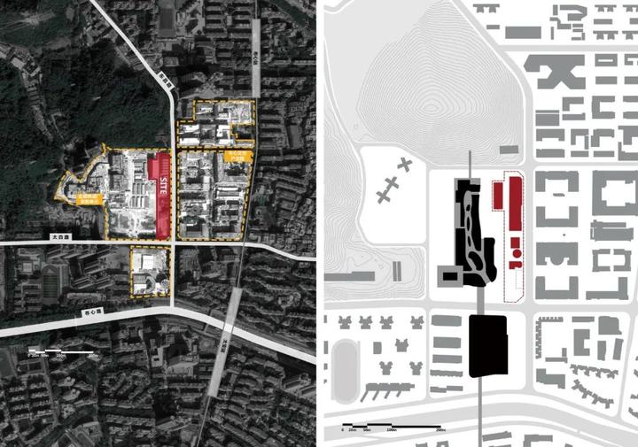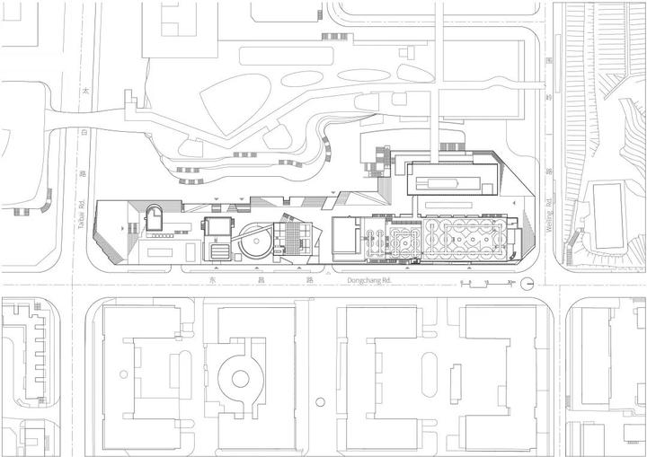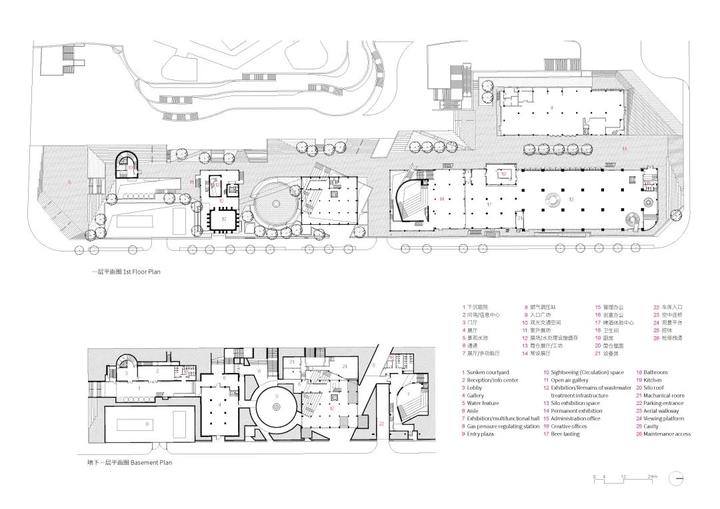 “基座”重新组织交通成为文化空间及展示工业建筑的舞台。基座顶部为室外展区串联各建筑,内部结合现状地下空间开挖一系列下沉庭院、通道与活动空间,创造出一条空间叙事主线。场地东侧的封闭立面打开数个空间形态不一的出入口, 266 米长的街道被激活。