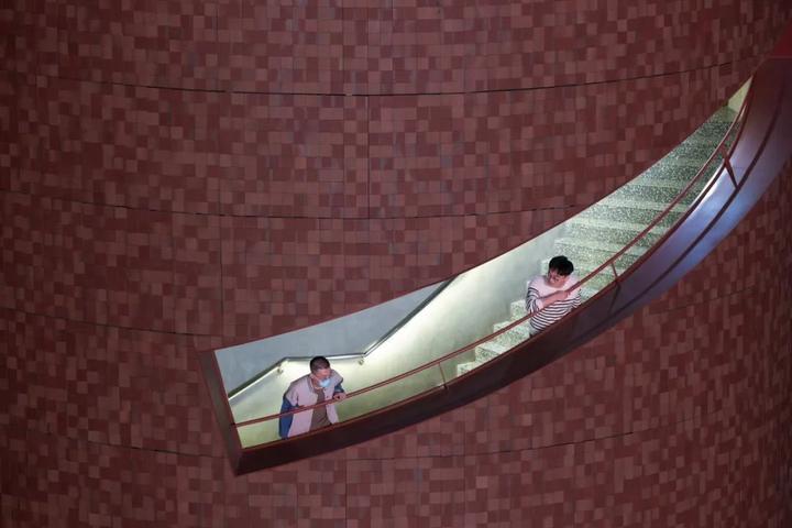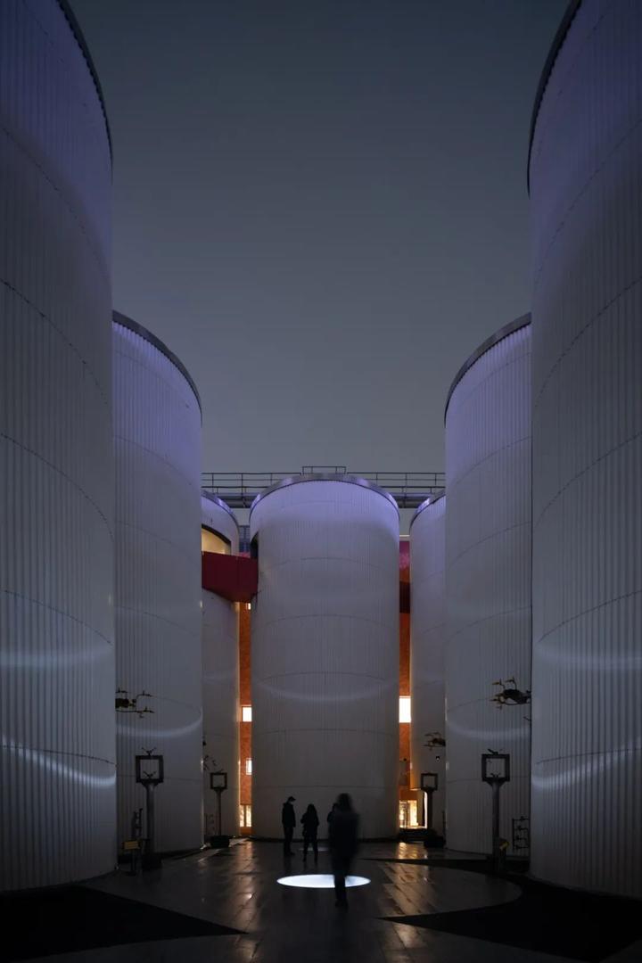 D4 屋面,拔掉中间三个直径7.5米的筒仓罐体,成为户外剧场,自然光从洞口进入室内形成聚光空间,适合展览或表演。切开筒仓进入罐体,加建旋转钢楼梯、电梯等垂直交通,剥去室内瓷砖和吊顶,混凝土天花板上的倒锥形罐体与裸露的混凝土结构还原出建筑空间的工业气场;顶部以连桥穿过罐体形成空中连廊。其中一个拔出的罐体被卧倒在 E 栋屋顶,成为空间装置。
