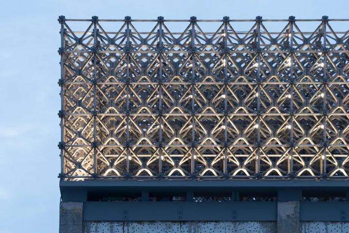 在C座曝气池顶部,金属铸铝杆件的拼接加以迷幻的灯光造就出一个金色构筑物,似啤酒泡泡在悦动。