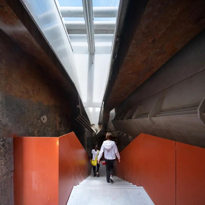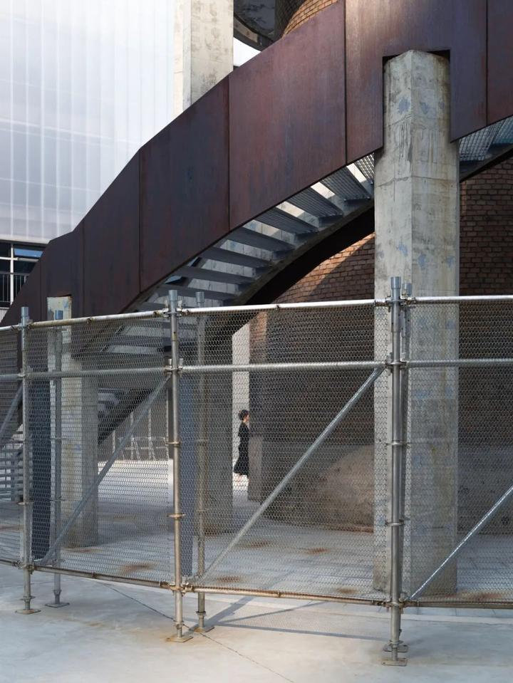 从物流到人流的功能转变,增加了组织展览流线和扩大消防疏散宽度的新要求。为此,我们在锅炉房的前广场上增加了一条直通三层主展厅的天桥。这座天桥拾阶转过门前的喷涌过岁月的大烟囱,在回应功能需求的同时,也把新的时间绕在了那段旧的时间之上。