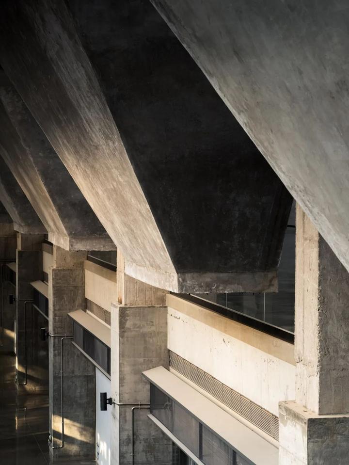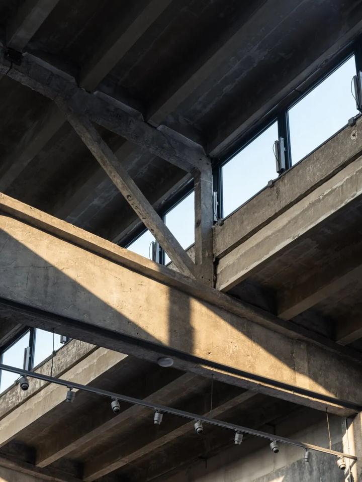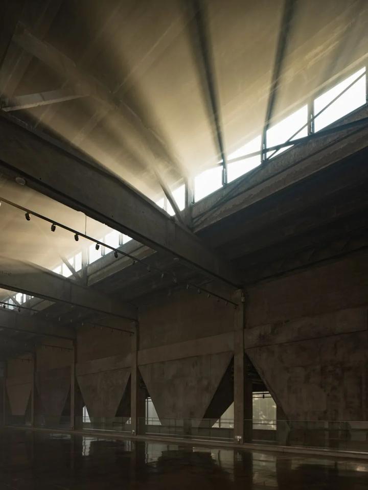 功能的转变还带走了老的生产设施,带来了新的建筑设备。部分较为杂乱机电设备经过优化隐藏,尽量减少了对原有空间的干扰。另一些具有表现性的管线选择了明露,比如主展厅的空调系统利用料斗和柱子之间的三角空隙布置了风管,配合 24 个球形喷口进行送风。精致的不锈钢风管,与原本粗拙的混凝土并置在一起,也相互映衬了各自的时代。