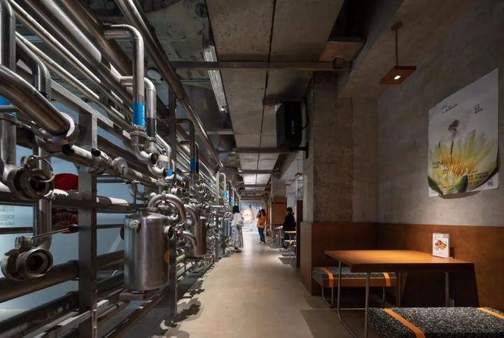 D1改造为多功能厅,同时在屋顶加建两层展厅。D2/D3部分保留原有罐体设备管道,生产车间变身为众声喧哗的啤酒馆。