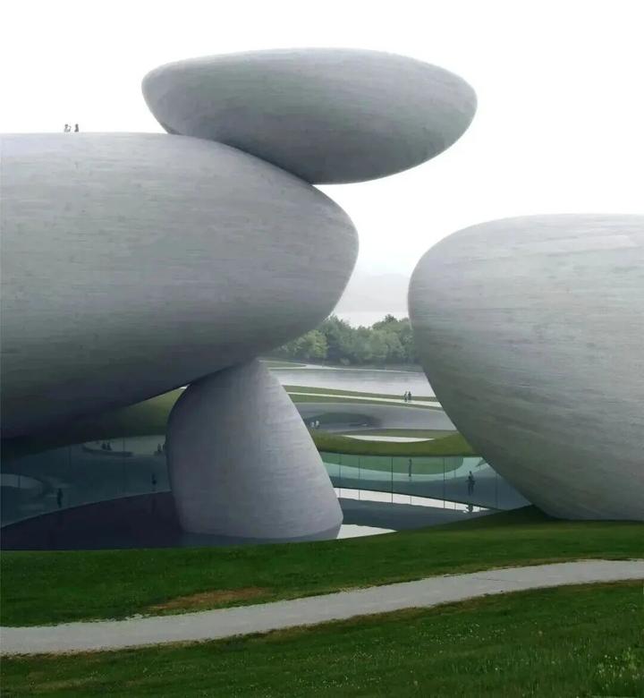 MAD建筑事务所提出了“远古”与“未来”两个时间尺度并置的设计概念,以“海边原石”为灵感,采用“水落石出”的独特形态设计,建筑群外观呈现为八块形态各异的“巨石”,与周边高楼大厦形成鲜明对比,营造一种超现实的场景,让人们回归想象。