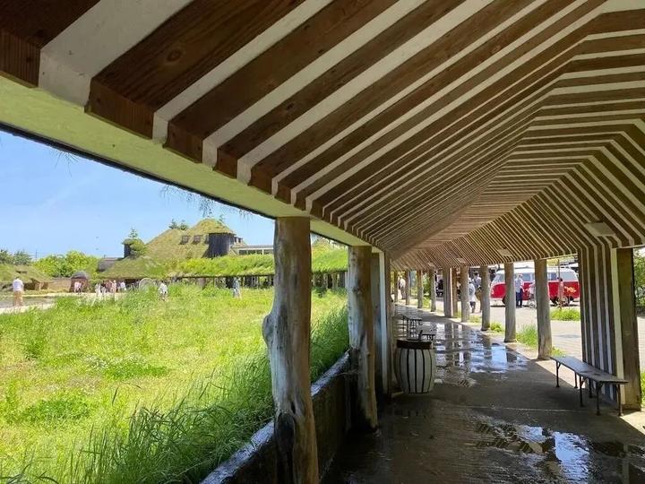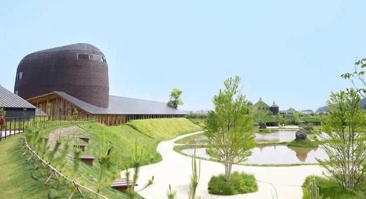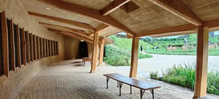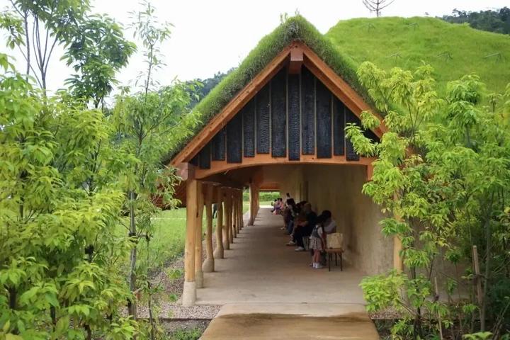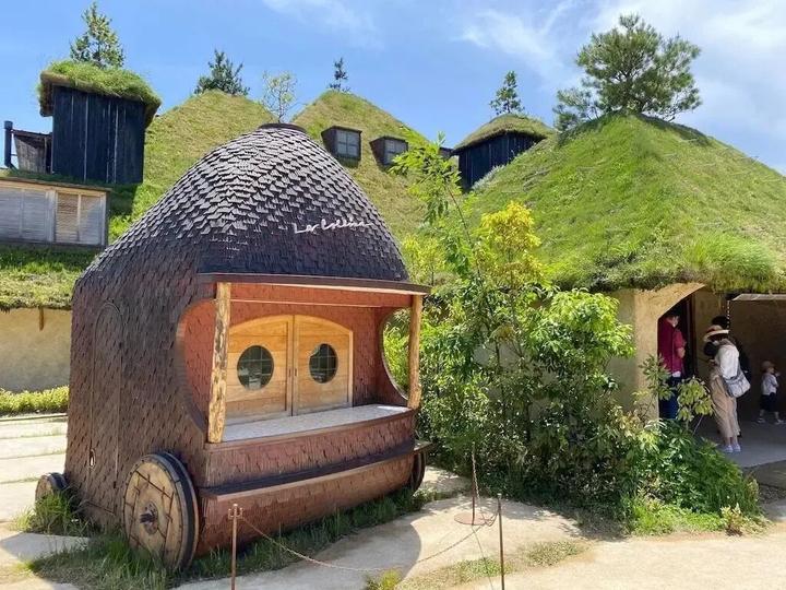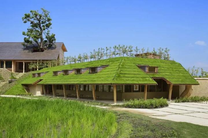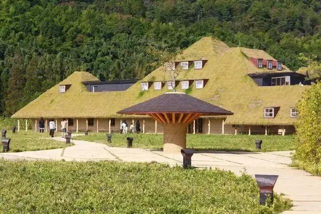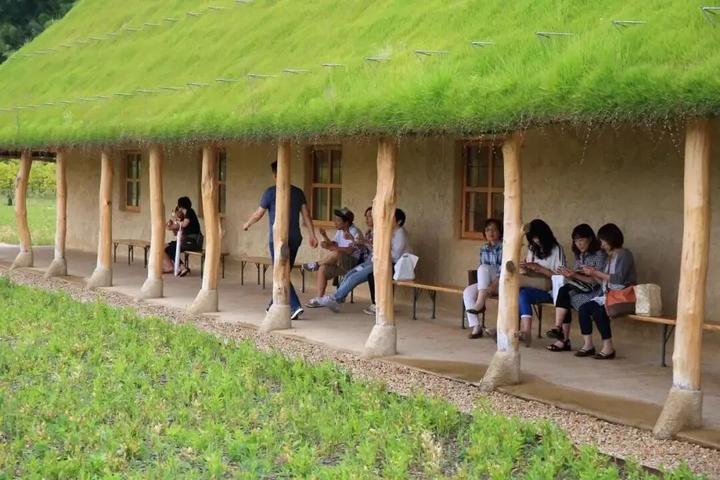 1.草根屋(Grass Roof):园区地标,屋顶覆绿草(随四季变化),外墙用烧焦杉木(防腐且隐喻“自然循环”);室内天花板以 “蚂蚁队列” 为灵感,墙面装饰百年和果子木模具。