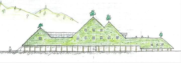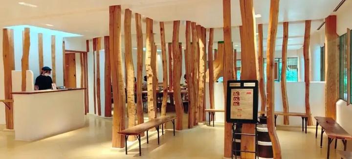 3.栗百本(Chestnut House):用 100 根未经加工栗木打造室内 “森林氛围”,草皮屋顶模糊建筑与自然边界;核心功能为年轮蛋糕展示销售,提供 “保质期仅 1 天” 的新鲜产品。