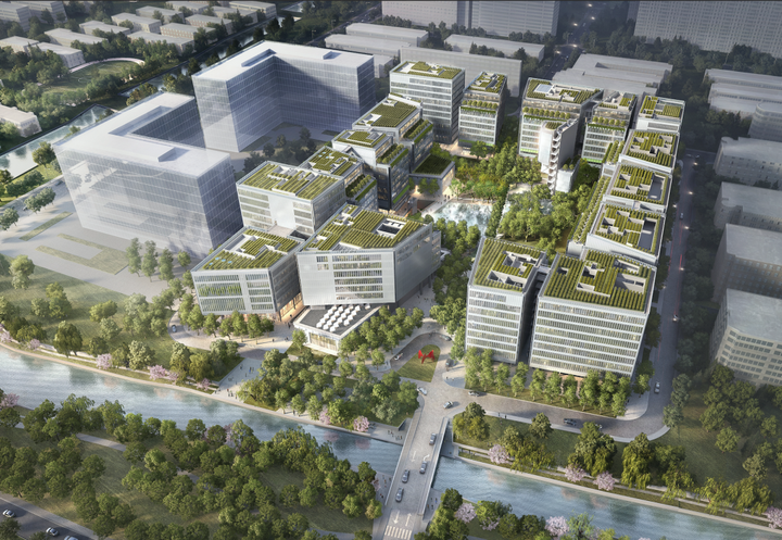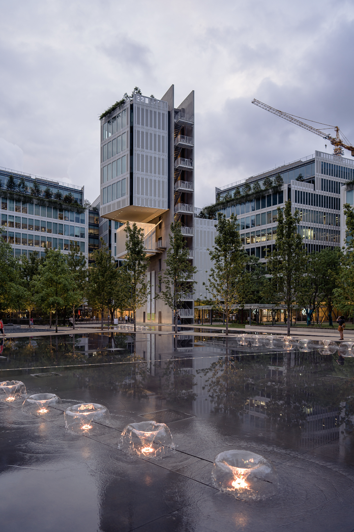 项目总建筑面积约23万平方米,由17栋单体建筑围绕一个130米×95米的中央广场布局,形成名为“城市客厅”的核心公共空间。建筑采用意大利DOTTOR团队施工的清水混凝土工艺,外立面使用进口阳极氧化铝板,屋顶种植茶树,镜面水景由西班牙JML公司打造,11个下沉庭院则由日本枯山水大师枡野俊明亲自操刀,融合“风、水、空”禅意主题。