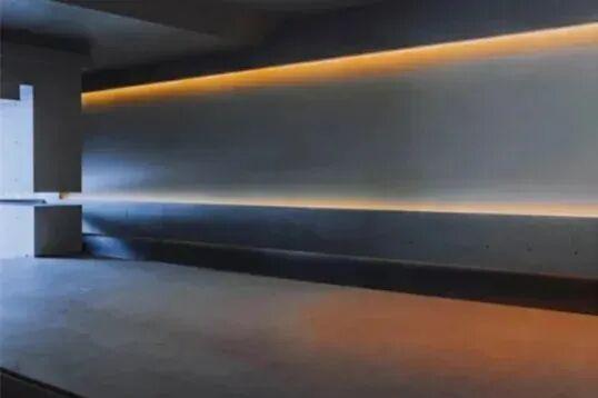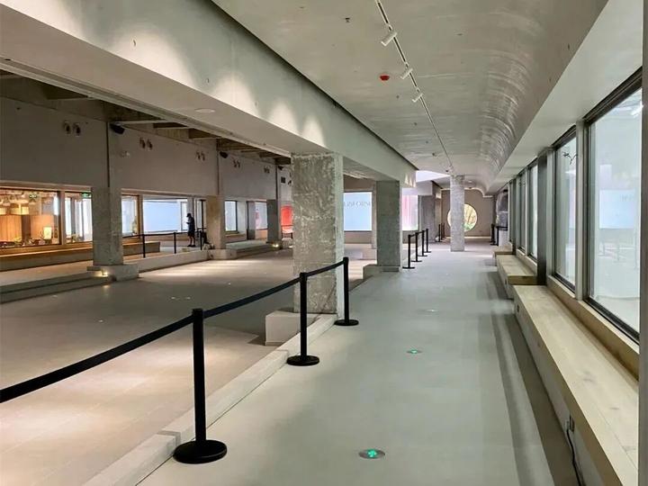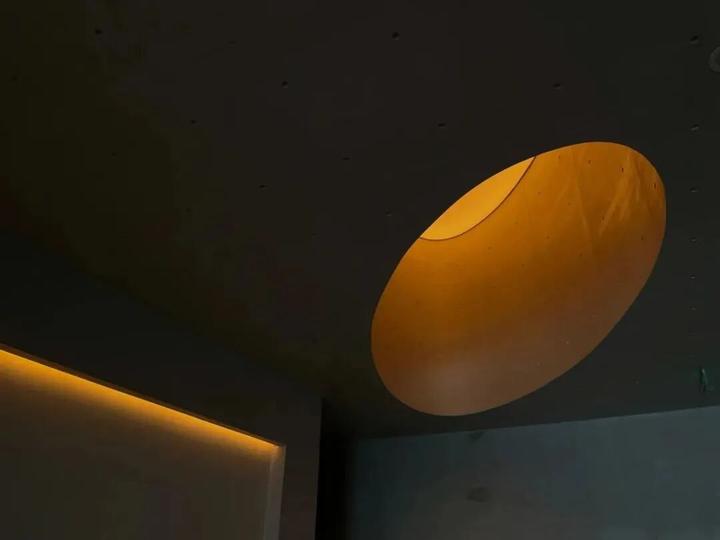 平淡的灰空间,有设计为顶面灯饰的天井,以蓝橙色光源作局部点缀。望向室外的绿树白墙,则时刻提醒你身处一座公园的地下空间。
