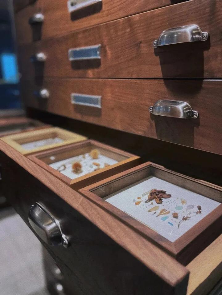 但这个标本博物馆并不是只能单向输出,人们需要像开盲盒一样,一个个拉开柜子查看内容,体验感既新鲜又惊喜,顾客也可以带来自己旅途中获得的落叶、树枝、花瓣、果实......主理人会把他们变成别具意义和价值的艺术品。
