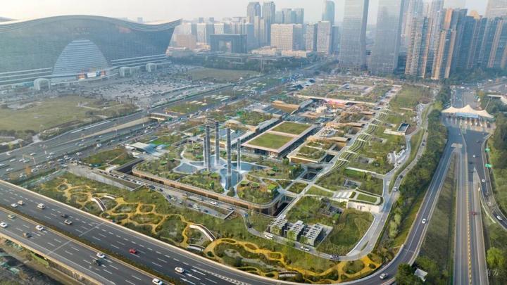 · 以海绵城市理念打造的可持续公园,是对成都市民的绿色回馈,也是城市建设的新模型;团队与以设计纽约高线公园而闻名的James Corner Field Operations合作,加强了生态基建和排水系统。