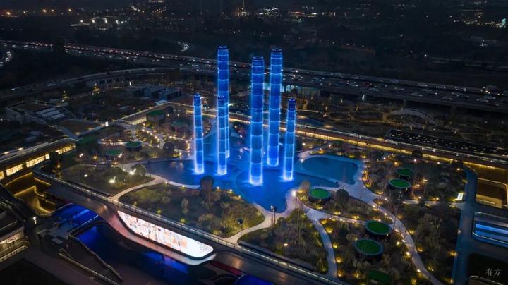 · 标志性景观之一的“生机之塔” 景观水柱,共六根,高度为26米和39米,柱身配有环形彩灯,拥有变化的流水和光影互动效果。景观水柱共设置5328个喷嘴、270个喷雾,5328盏下射灯、240盏上射灯、53台水泵;整体装置配有净化设备及软化消毒过滤设备。
