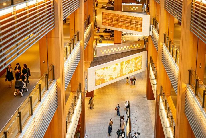 其中,地标塔楼以日本传统庭园设计中的“庭石”为原型,同时,商业设施中大多采用拱廊型的竖井式空间结构,通过大面积使用木质材料与自然光的引入,来营造日式美学所追求的简洁与高级感;而商业设施的公共空间,则加入了混凝土或镜面等材质强调设计和时尚感。同时,六本木中城保留了原址中百余株樟树、银杏、樱花树,并通过“建筑退让于景观”的方法,将4万平的绿地分解为屋顶花园、空中连廊与地面庭院三层体系,从而让绿植景观从“观赏属性”转化为“动线”的重要组成部分。