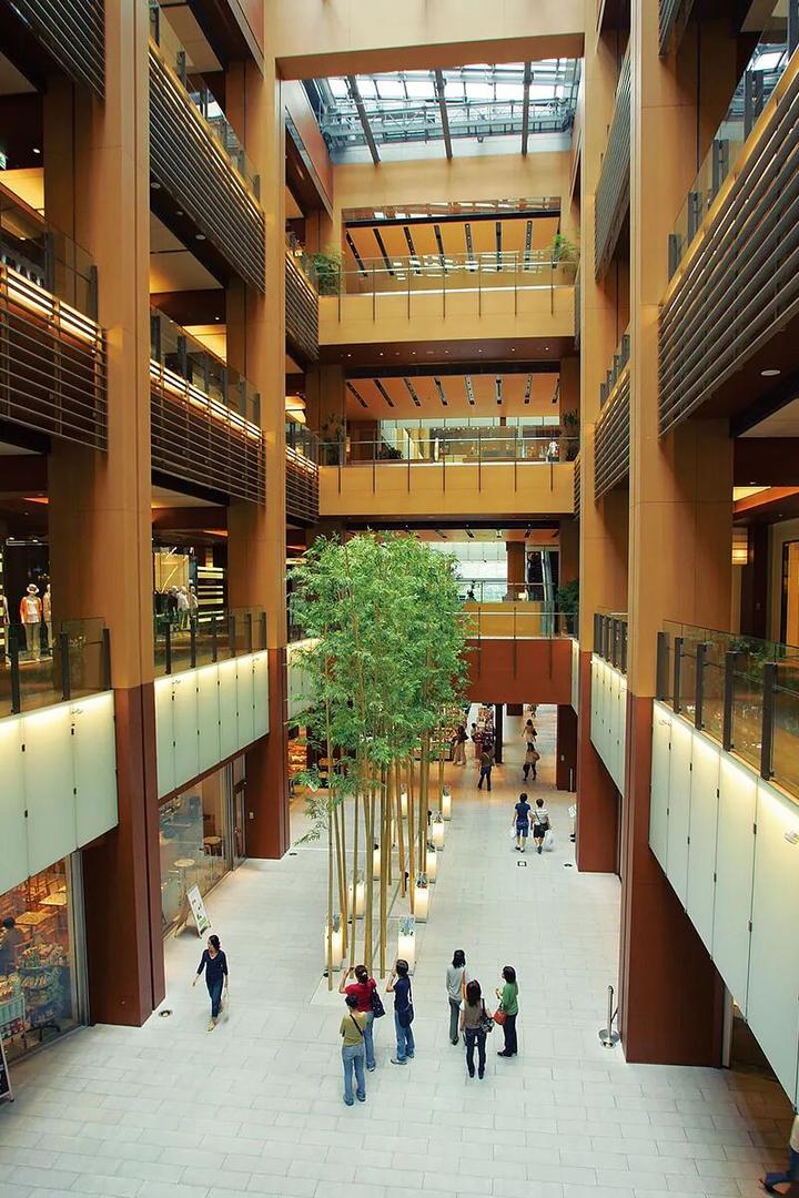在土地资源紧张,居住面积狭窄的东京都内,这种阳光普照、自然绿色、宽广自由的建筑叙事方式,能够让在这里居住、工作、消费的人们,自然而然地生出来一种“阶层流动”的幻觉。