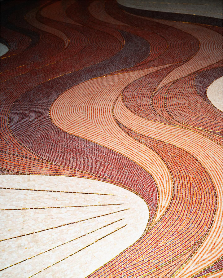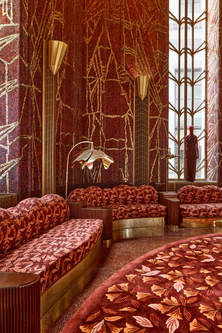 这个区域由 Hildreth Meière 于 1931 年创作的红色和金色马赛克瓷砖装饰,呈现出一幅动感十足的艺术画卷。设计灵感来源于森林的自然景观,光线与材质的变化让空间仿佛呼吸一般,流动的光影和金色倒影在空间中创造深度感与层次感。