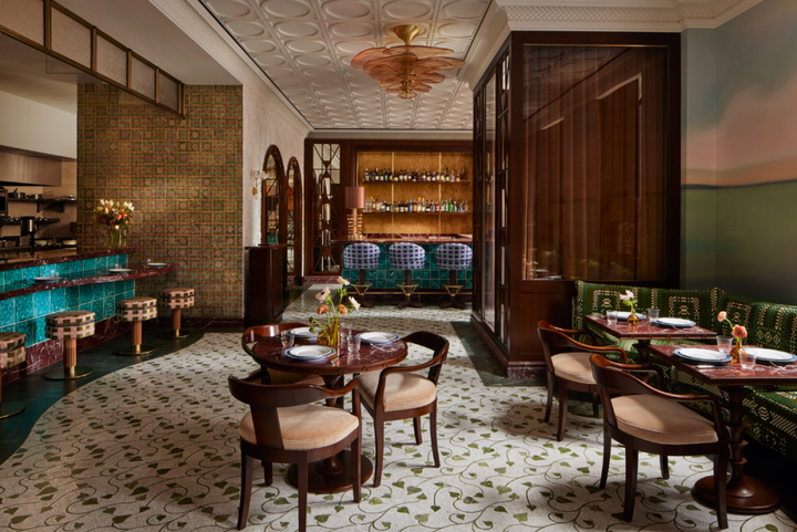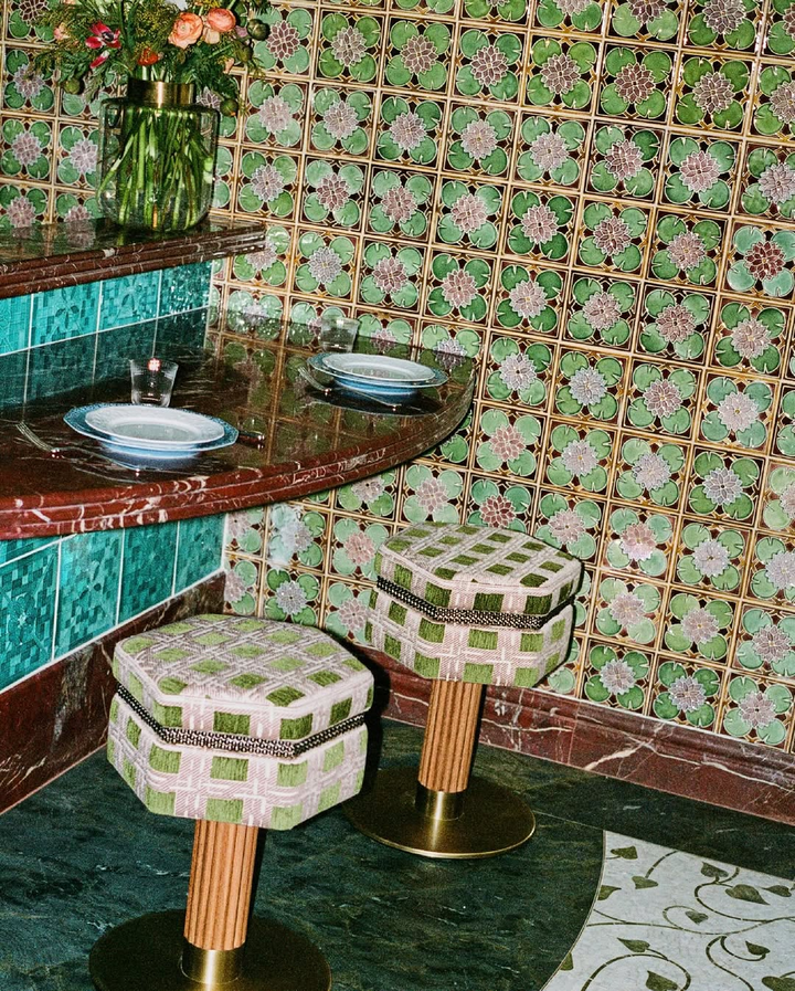 餐厅内部层次分明、充满故事感。地板铺设了巨大的植物图案马赛克,墙面则饰以手工瓷砖,展现出工艺与时间沉淀的独特美感。