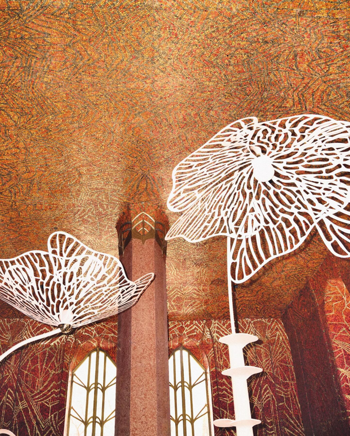 墙壁采用闪亮的金色马赛克,模拟古树的树皮质感,而巨大的花朵和光影互动,随着时间的推移展现出不同的生长轨迹,投射出的光影随之变幻,赋予空间动感与生命力。