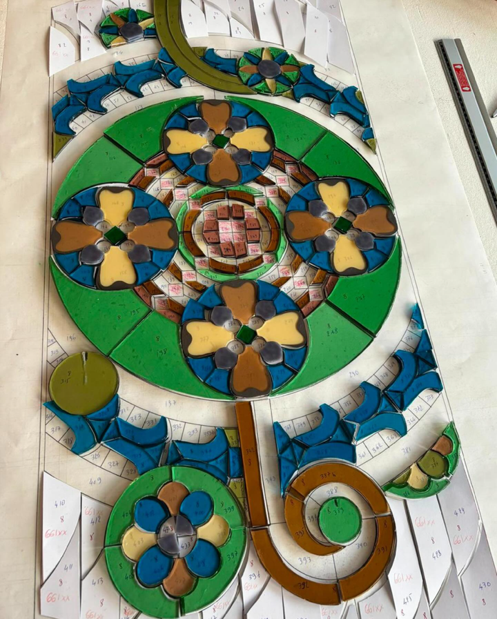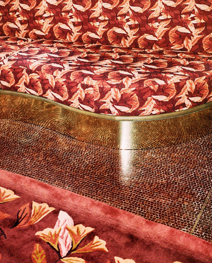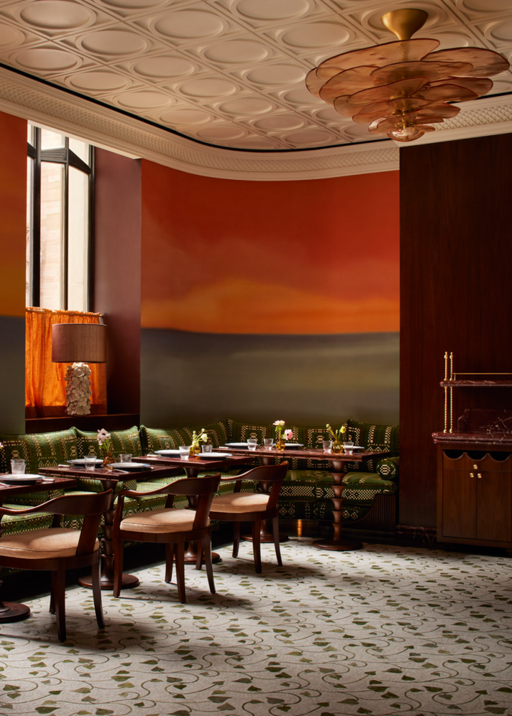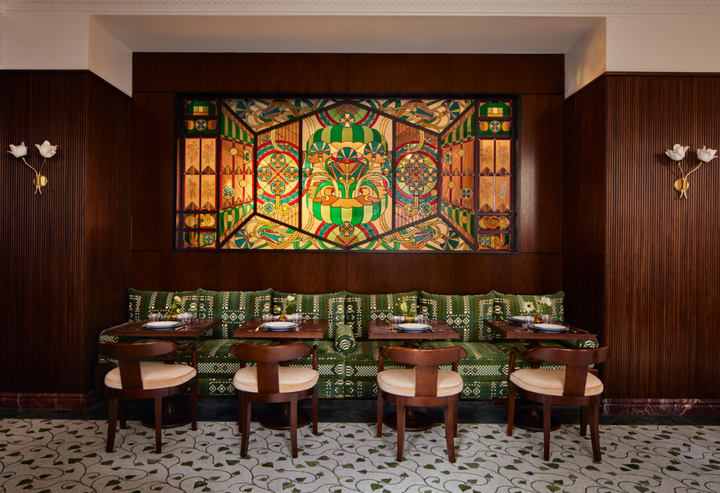 最引人注目的,是与艺术家 Pierre Marie 合作打造的植物图案的彩绘玻璃。其作品以华丽的丝带、大胆的色彩和充满异域风情的巴洛克式元素著称,为餐厅注入了俏皮、慷慨而富有诗意的活力。
