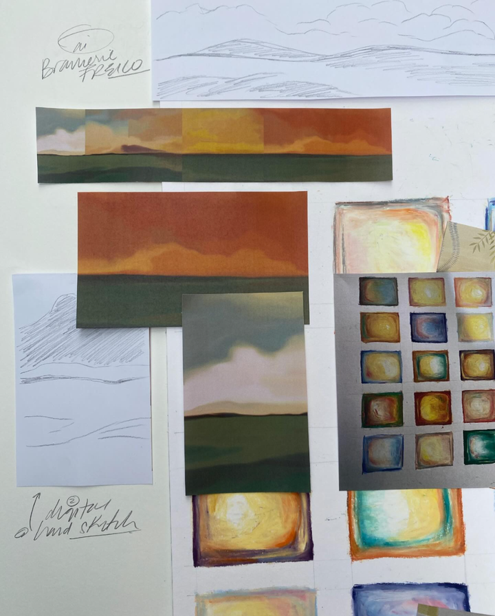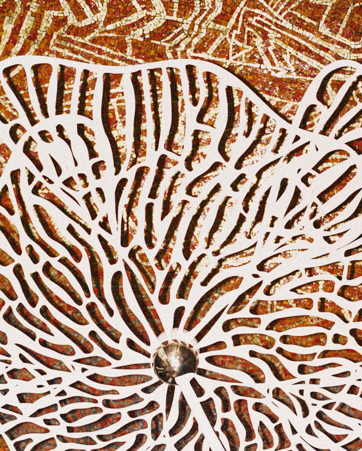这幅壁画将空间打造成一个如梦如幻的花园,金色与银色的棕榈树、细腻的叶片、热带植物、樱花及羽毛状的植物交织生长,所有元素在金色的天空和轻盈的云朵中和谐共存。
