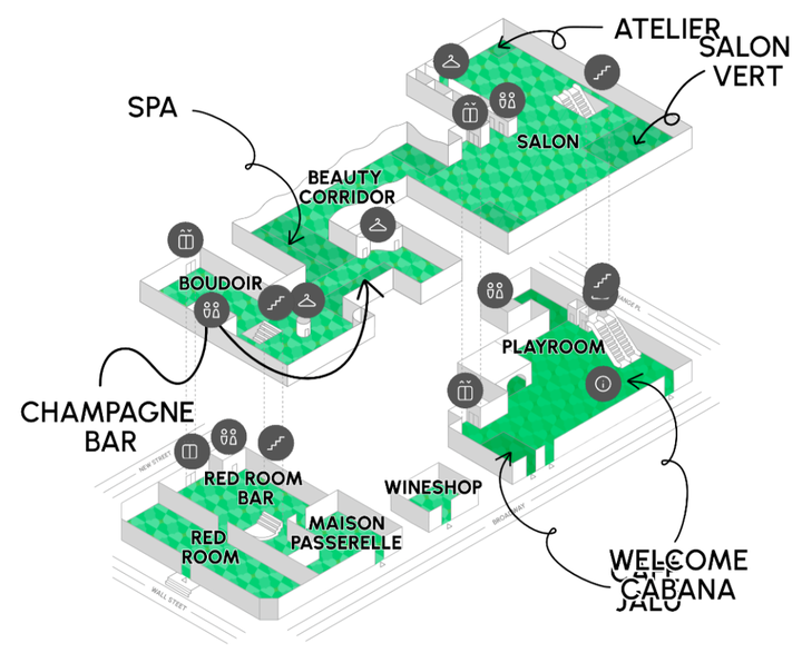 Le Salon 的设计灵感源自巴黎的浪漫氛围,旨在将巴黎的优雅带到纽约。为了实现这一目标,设计师特别创作了一幅宏伟的植物壁画,灵感来源于 20 世纪 30 年代奥斯曼春天百货的经典壁画。