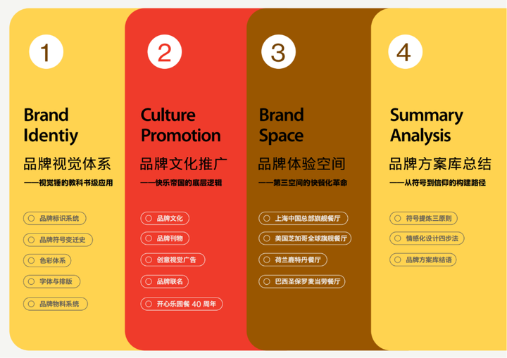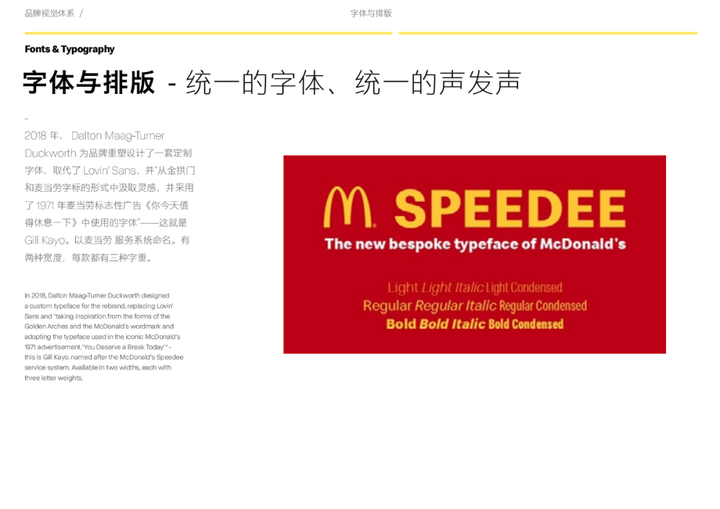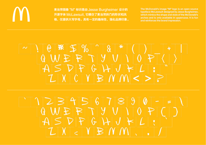 品牌设计:50年代,麦当劳对餐厅进行了一次全新的升级。设计由美国设计师Stanley Meston亲自操刀,外墙使用了红白相间的线条,十分醒目。为了让餐厅的屋顶结构显得更加饱满,设计师在餐厅的两边分别加入了一道金色抛物线,搭配上金色的霓虹灯,就这样,金色拱门正式诞生了。金色跳跃的双抛物线传递着动感和能量,这个醒目的标识在英文里被称为“Golden Arches”,中文里叫“金色拱门”。