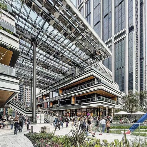 上海苏河湾万象天地,将历史人文、绿色生态与零售体验融合,以“城市峡谷”为设计概念,打造具有城市影响力的文化艺术生活聚集地,而非单一购物的目的性商场。