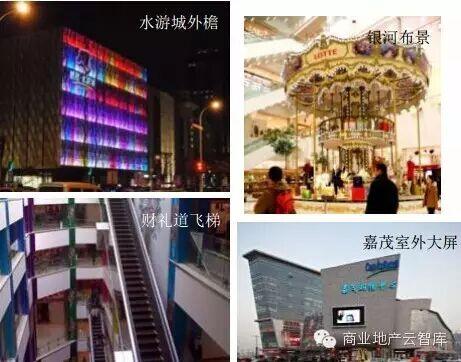 炫丽的外檐形象—水游城;精致艳丽的美陈布景—水游城、银河;新奇又快捷的飞天梯—财神道;动感的室外LED大屏—嘉茂、伊势丹;“一站式”的业态组合—水游城、万达、银河;丰富时尚的品牌组合—水游城、银河。