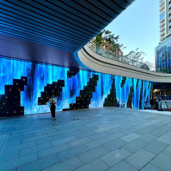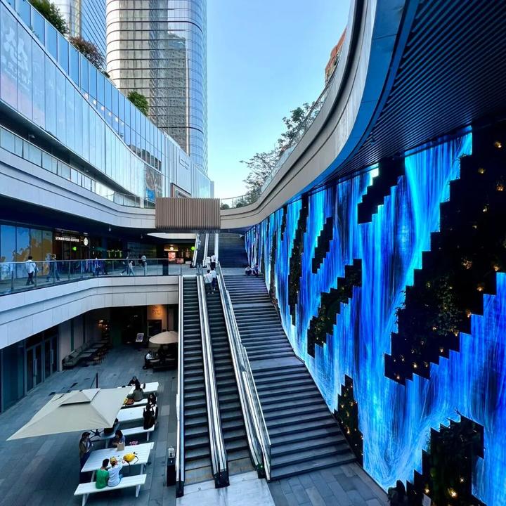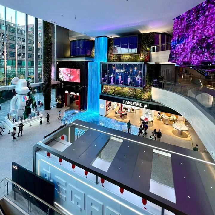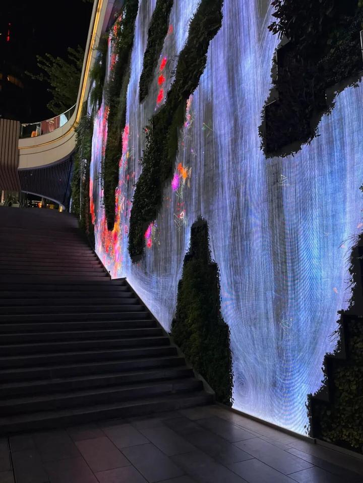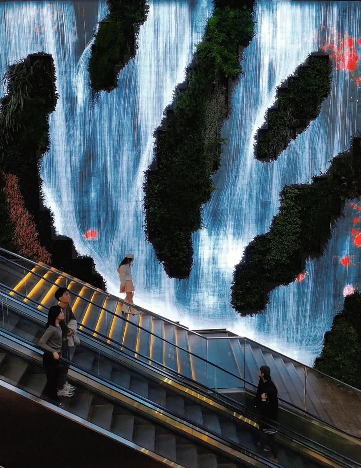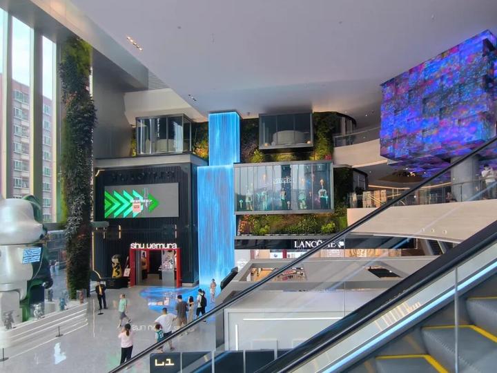 这个就很有意思,巨大的艺术作品,通高绿植装置,搭配连接三层数字水幕牆、错落有致的绿植小品,共同建构了丰富的视觉层次。