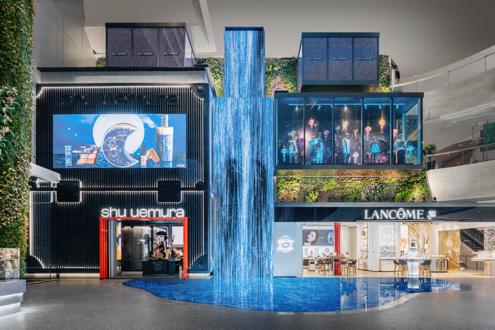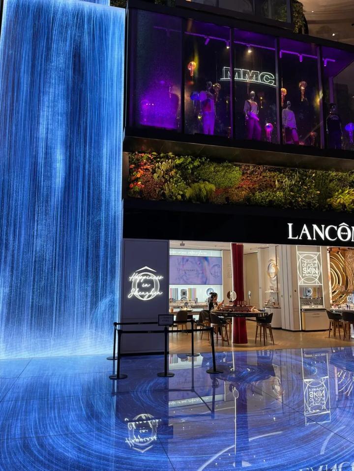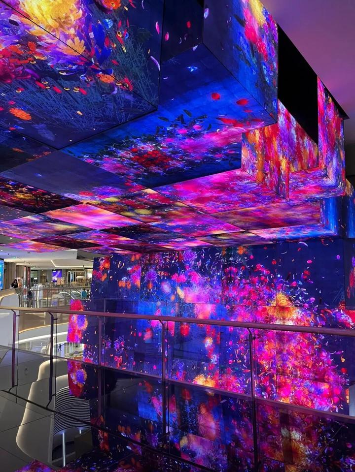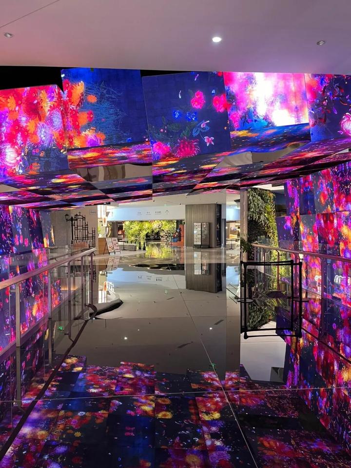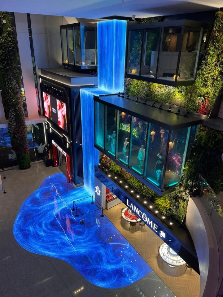 这个就很有意思,巨大的艺术作品,通高绿植装置,搭配连接三层数字水幕牆、错落有致的绿植小品,共同建构了丰富的视觉层次。