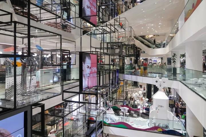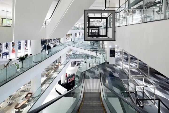 商场的每一层都以策展形式设计,商铺不仅展示商品,还融入了艺术装置和时尚展览。整体空间的设计让顾客不仅是购物者,还成为“文化体验者”。商场内设有多个互动空间和展示区,使品牌展示更具艺术性与沉浸感。