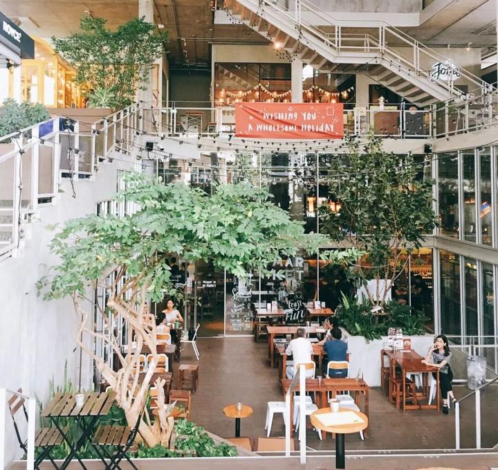 不仅传统意义上的商场中庭设计是如此,在一些小型社区商业空间设计中也同样能看到从自身定位出发的中庭设计。比如,位于泰国曼谷的精致社区商业The Commons。