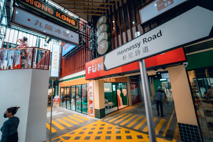 值得一提的是,项目还进驻了多家“中国品牌”,如HUAWEI、六福珠宝、蜜雪冰城、吃茶三千、贡茶、味蜀吾火锅、小肥羊等,巧妙地与香港主题相呼应。