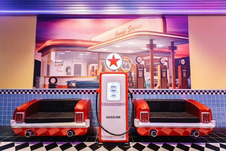 4-5层(美国旧金山村):厕所以荷里活为主题,包括粉色百老汇剧院后台更衣室,以及60年代美式风格加油站的咖啡厅等。