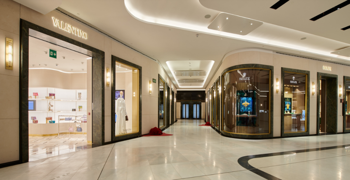 品牌方面,项目共引入了40多个时尚、精品珠宝、香水和配饰品牌,包括马仕、卡地亚珠宝店、Louis Vuitton、OMEGA、劳力士、圣罗兰、Valentino、杰尼亚(Zegna)、Aquazzura西班牙首家精品店、Jimmy Choo等。此外,位于商场一楼的是由Isolée打造的Beauty Gallery,进驻了20多个高级化妆品和香水品牌。