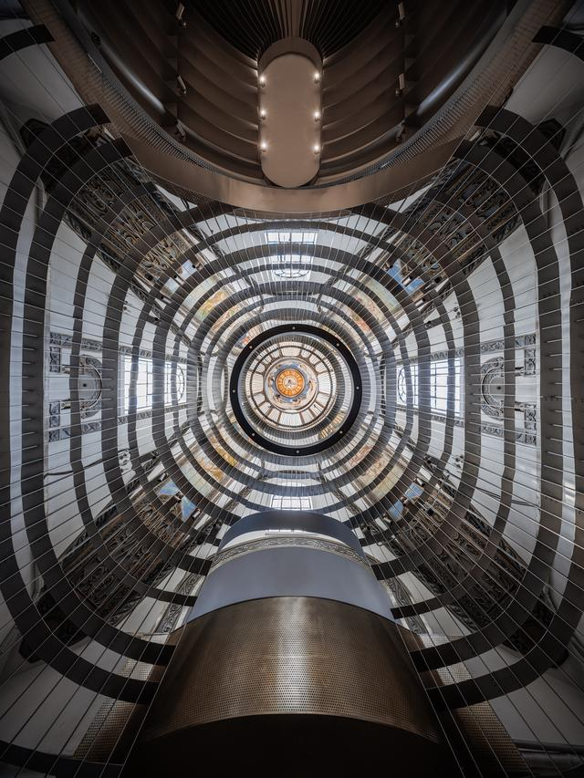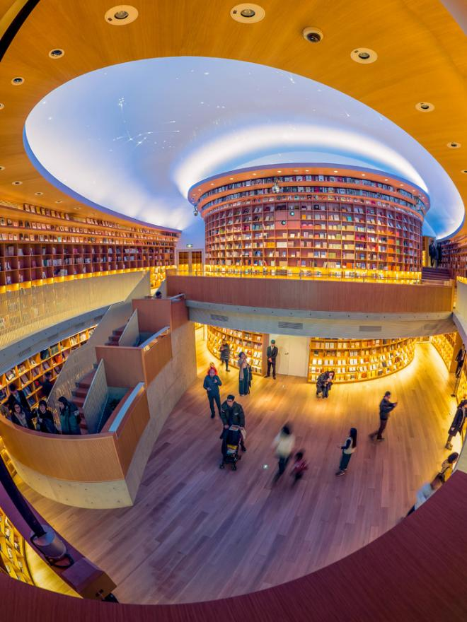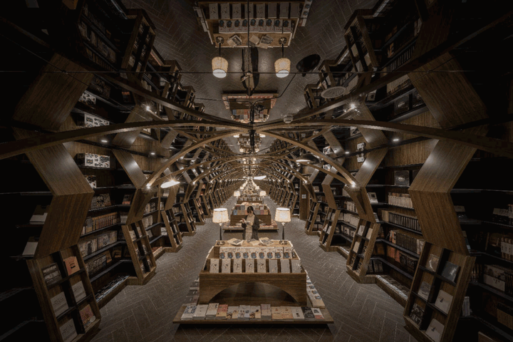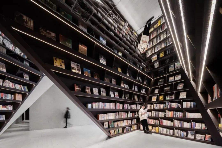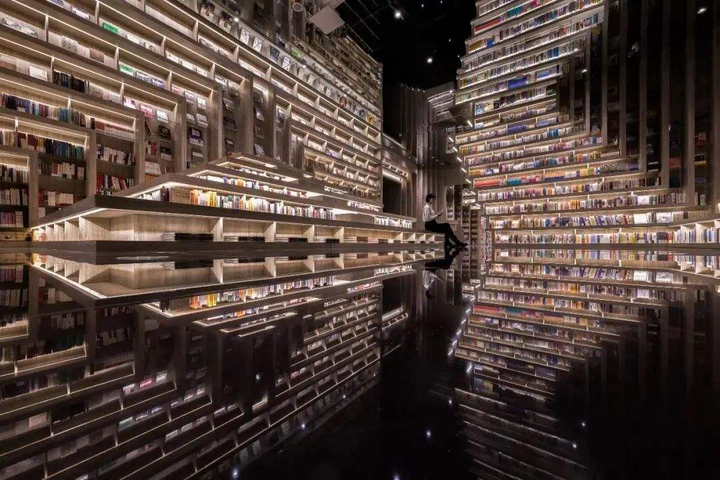 设计师将六百平方米的书店钟书阁,切割为黑白两极世界:下层被四面如私人书房的书海包围,让爱书人在黑框中搜索过去的阅读记忆流连忘返;上层走廊配以虚拟未来的黑镜,至于“桃花源”的中心,是一座洁白的阅读圣殿,天花顶上的镜像,令人有置身科幻版博尔赫斯“巴别塔”的错觉。
