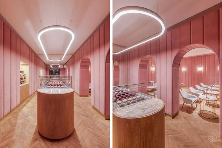 法式泡芙是这家蛋糕店的主打产品,同样也是这家店的设计灵感。空间内也摆放着一张如法式泡芙形状的长条柜台,里面展示着精致如艺术品般的小甜点,供顾客观赏。
