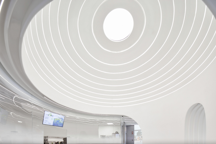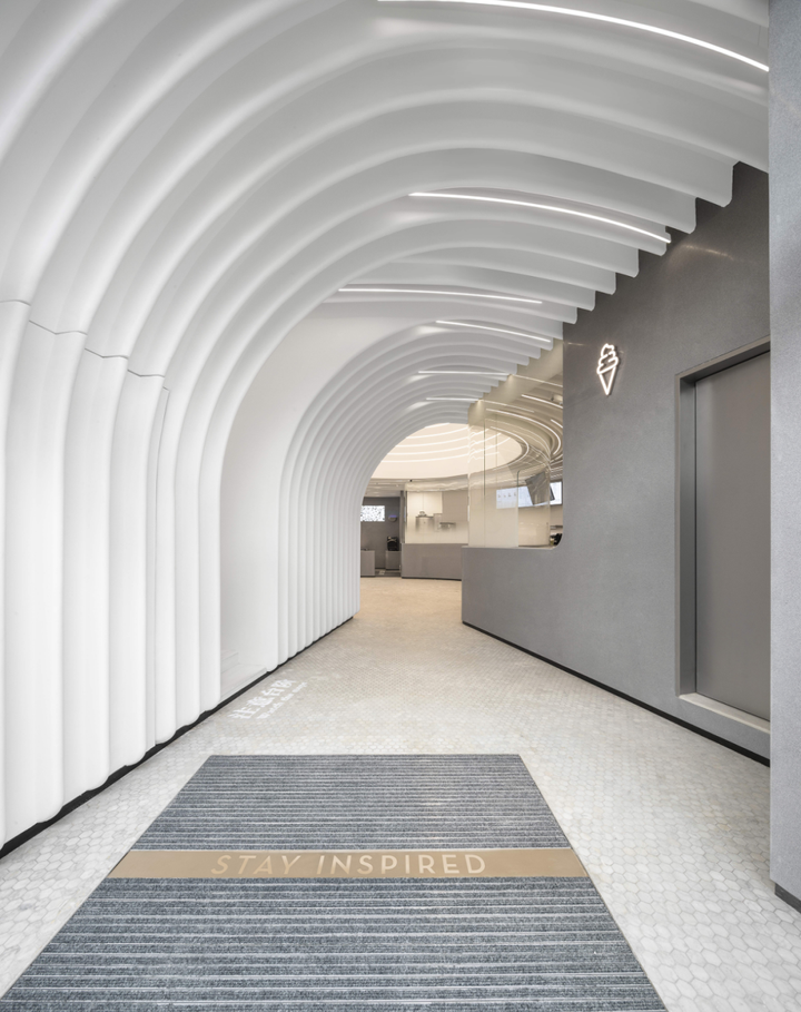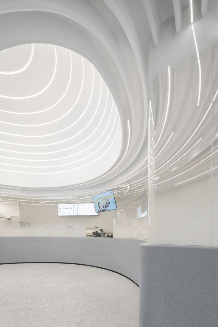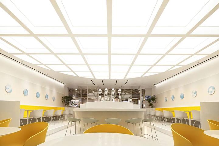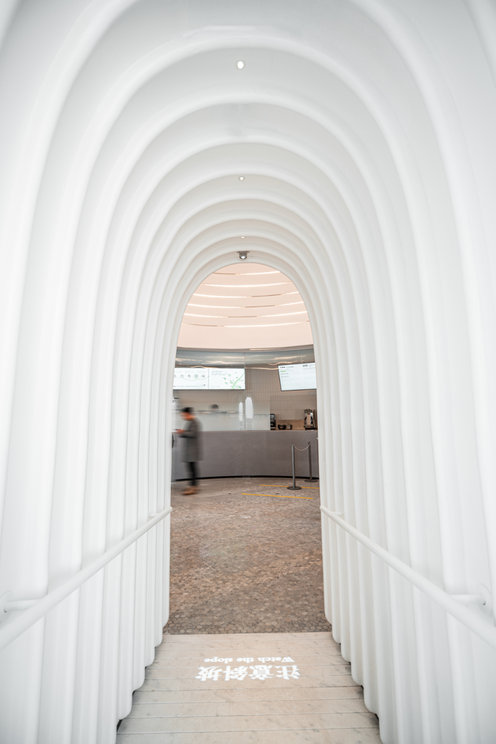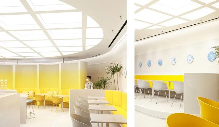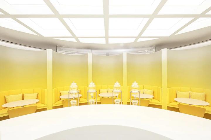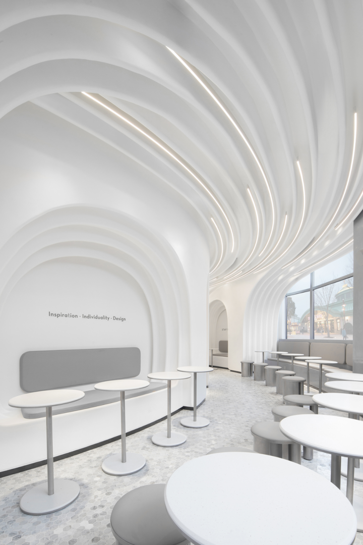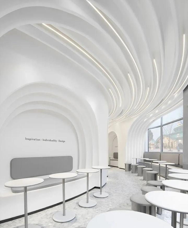 立体的圆弧造型将座位区、天花板和中间的圆形穹顶连接起来,一体化的设计手法让视线无碍游移于空间的各个角落。无所定形、难以定义的流体形态,摆脱了横平竖直线条的秩序和整饬,预示着一个没有桎梏的消费体验环境和自由氛围。