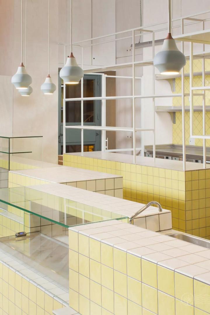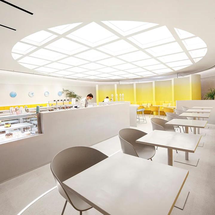 黄色仿皮软包定制长椅,和来自荷兰的家具品牌HAY的椅凳配色与整体空间的灰色黄色相匹配。侧墙材质选用意大利瓷砖品牌IMOLA的3d泡泡砖。墙上所挂艺术品则来自INSTANT HUTONG根据茶聚场品牌元素定制的光栅板,如两侧的飞机窗望向天空。灰色人造石长吧台同时附带了所有吧台部分的功能以及对外展示新鲜的烘焙制品。吧台尽头半圆形桌台则为茶汤萃取提供了天光下明亮的舞台。