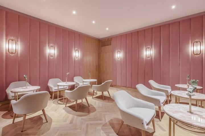 粉色天鹅绒的墙面,搭配黄铜色的装饰物、玫瑰色大理石台面、橡木地板等等,让整个空间充满了法式精致的梦幻感。