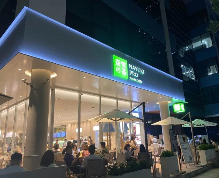 门店分为室内和户外区,白色为主,绿色的标志在夜晚中格外显眼,PRO的标志与奈雪的英文等大,足以证明奈雪对PRO的重视和认真。