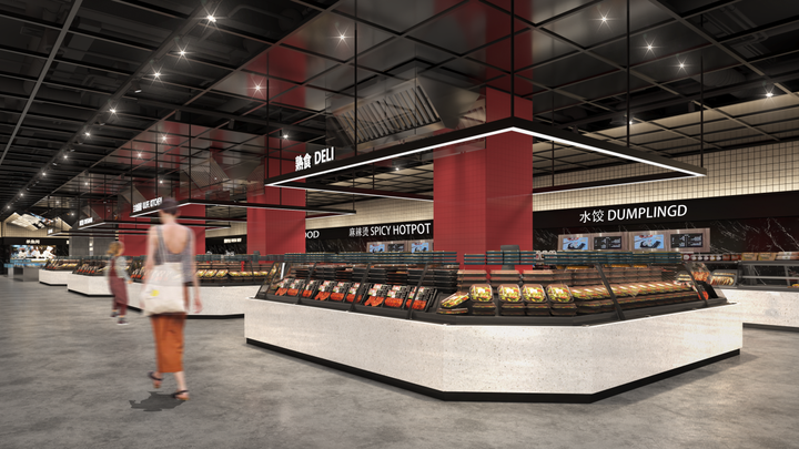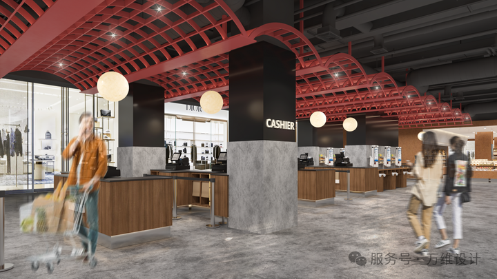 针对原始空间动线不通透、冷区存在等问题设计新增广场连接入口,将停车场入口改为超市街区入口,优化多出入口导视系统,最大化共享客流;同时通过开放式布局与场景化陈列,让原本的空间冷区变身互动体验点,让每一处角落都充满活力。