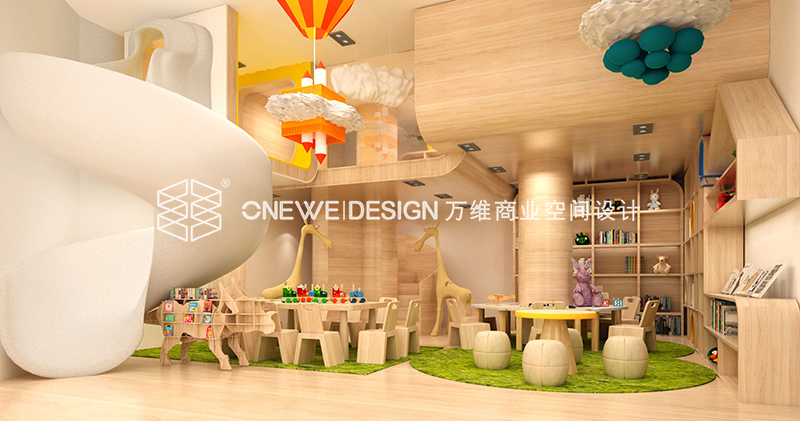 早教区以弧形线条以及白色与木纹搭配,强调舒适温暖柔和的空间形象,使消费者放松下来。