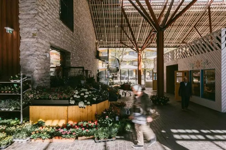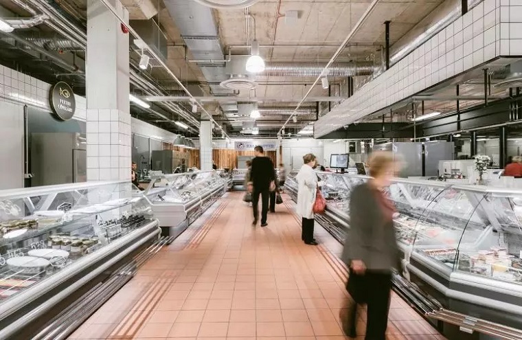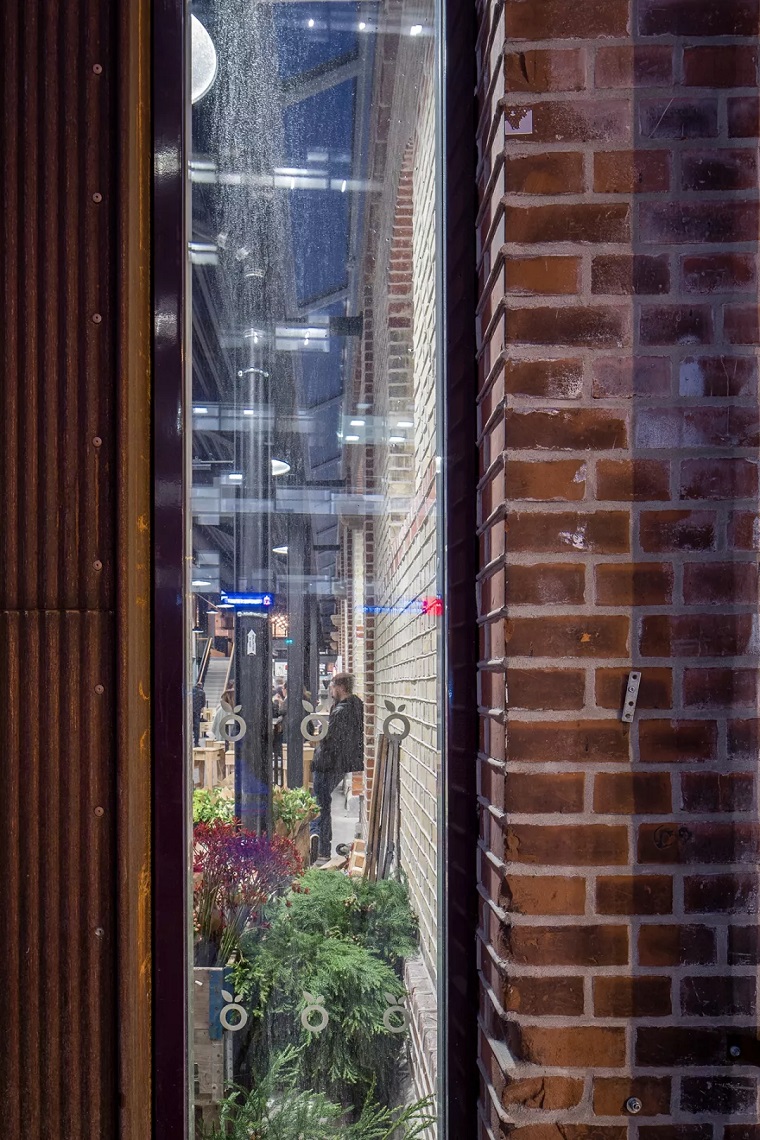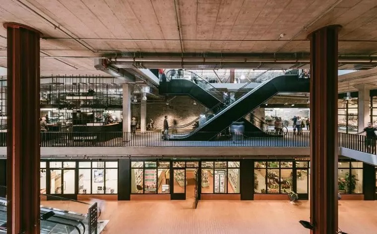 就是建筑内部而言,主要力量集中在如何展示原有市场的历史性和如何有意识地避免创造全新的历史细节上。建材的色调通过各种颜色的砖和与砖大小相同的瓷砖颜色组成。商店的正面和栏杆采用木材和黑金属制造。总体照明采用温暖而稳重的色调,在需要的情况下,特定货品和商业则采用特定的照明模式。