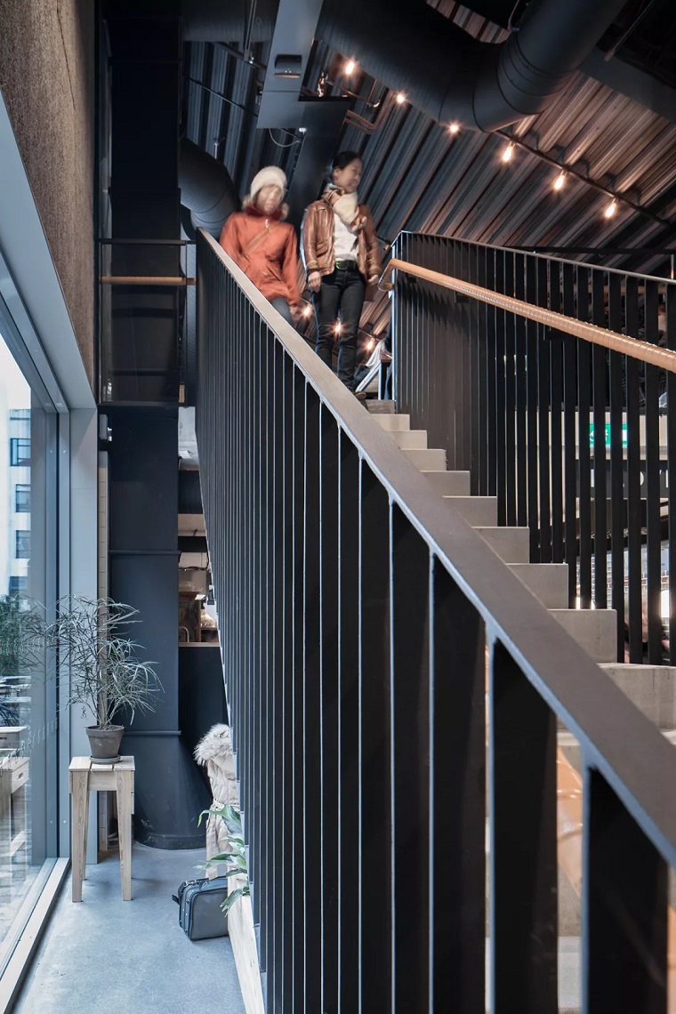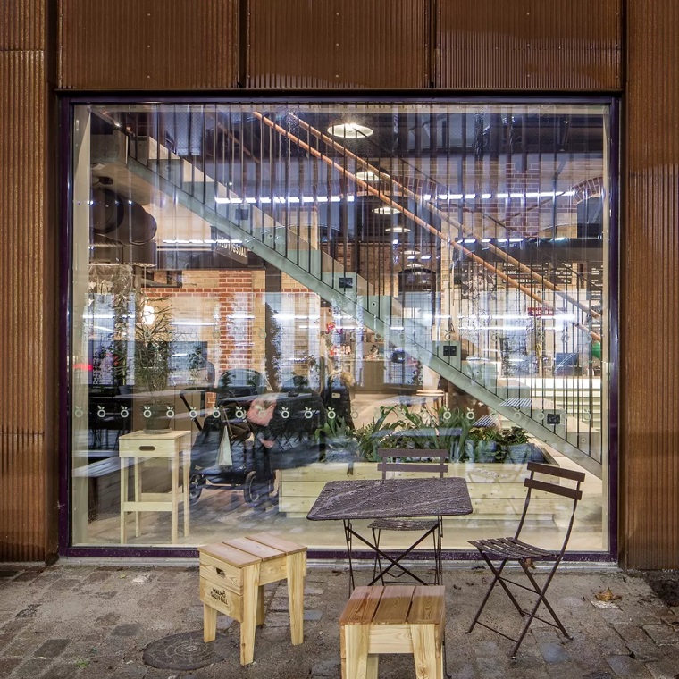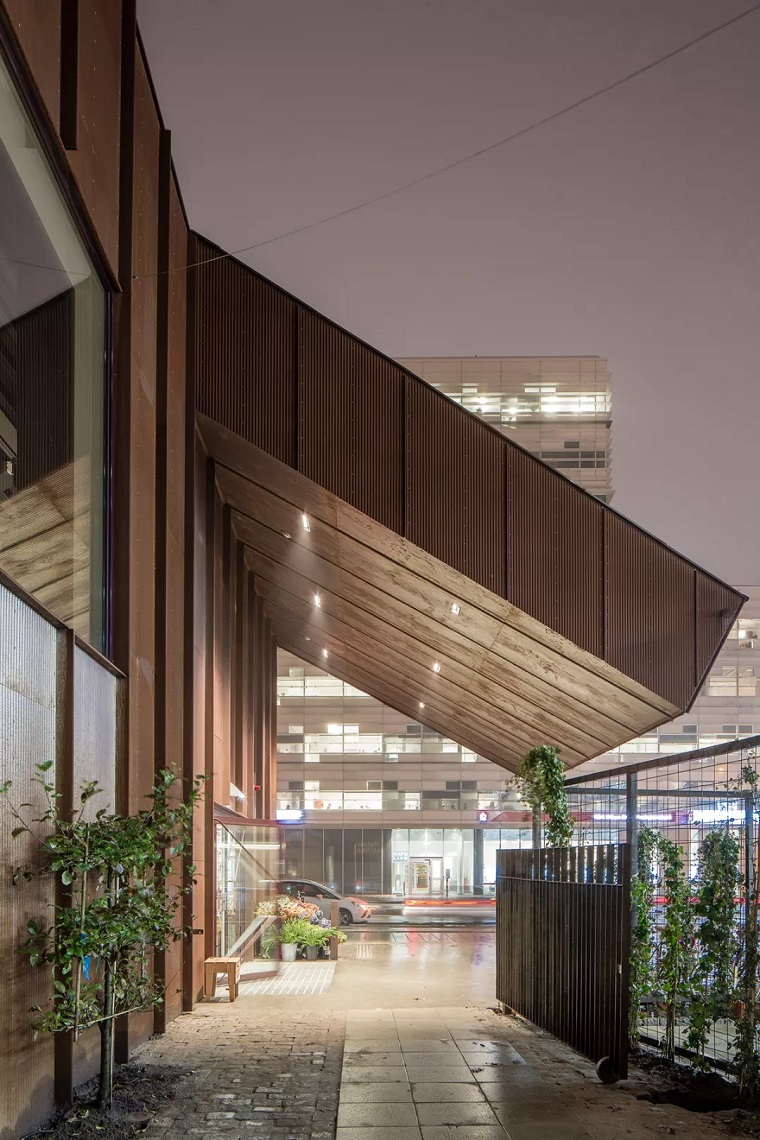 将当时连屋顶都没有的空壳建筑改造成供大约20个商户和餐馆使用的市场,设计师在原有建筑的基础上模仿它的山墙轮廓进行扩建,为了保留该建筑原有的工业特征,他们使用了红色锈面的波形钢片。“扩建的立面是合理的,使用标准化的波纹钢与突出的、垂直的钢型材相结合,使立面在窗框和门廊上具有节奏和稳定性。”项目建筑师解释说。