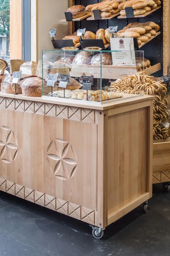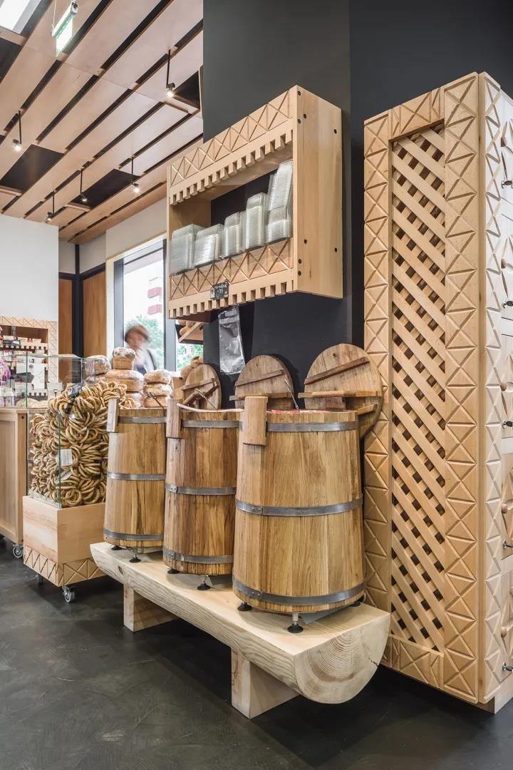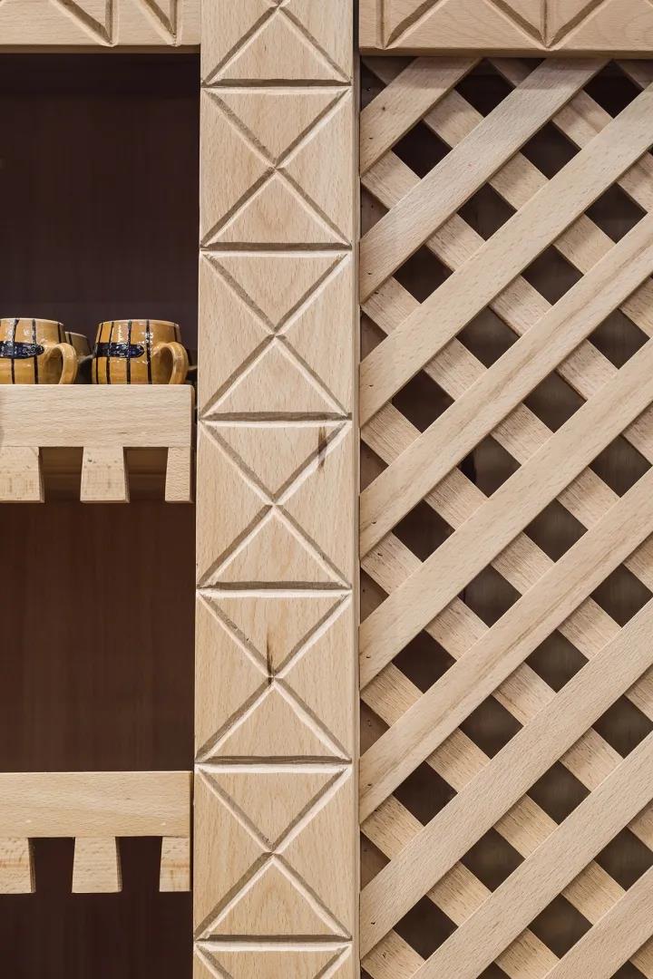社区超市空间的设计以罗马尼亚传统建筑中经常元素如门廊的雕刻木雕图案、旧储藏室的架子、带有巨大木门的地下室和带有挥舞木雕图案的谷仓等为元素,让整个空间紧扣主题。