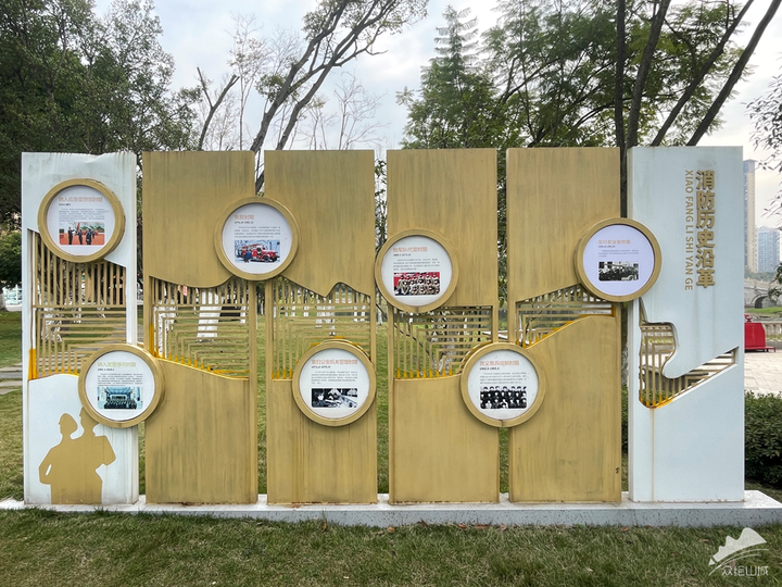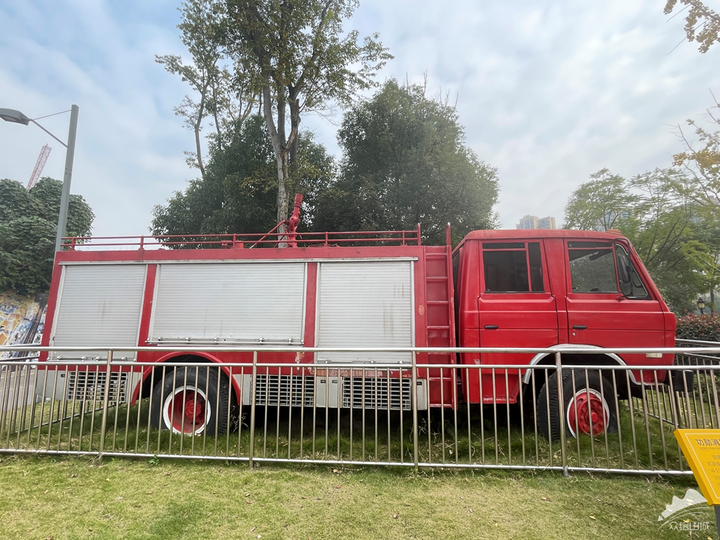 雕塑的左边停靠着一辆有故事的消防车。它于2008年开始服役,2016年退役,期间安全行车36万公里,服务各类灭火救援战斗1500余次,曾参与2013年潼南大佛机车配件厂火灾、2010年“7.12”和2013年“6.30”抗洪抢险等重大火灾扑救和抢险救援行动,是名副其实的功勋消防车。