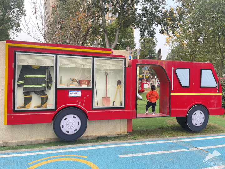 展示消防服和救援设备的橱窗被装扮成消防车的模样,是公园的热门打卡点。