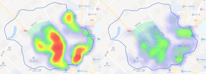 ▊15分钟步行范围人口热力图(图左:常住人口,图右:工作人口)