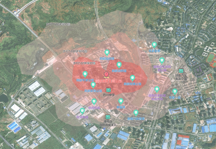 百度慧眼人口数据显示,公园15分钟步行范围内有约2.6万常住人口和约1万工作人口。其中,常住人口主要集中在多个住宅小区,工作人口密度较低,主要集中在巴川中学和嘉年华购物公园。