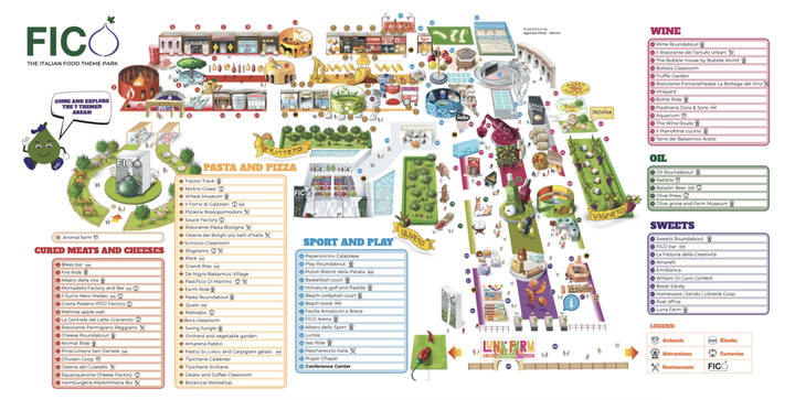 Fico Eataly World(以下简称为Fico)共设置了8大主题体验区,分别是:熏肉和奶酪区、意大利面和披萨区、葡萄酒区、食用油区、糖果甜点区,外加动物农场区、运动游玩区,以及一个儿童游乐园Luna Farm。