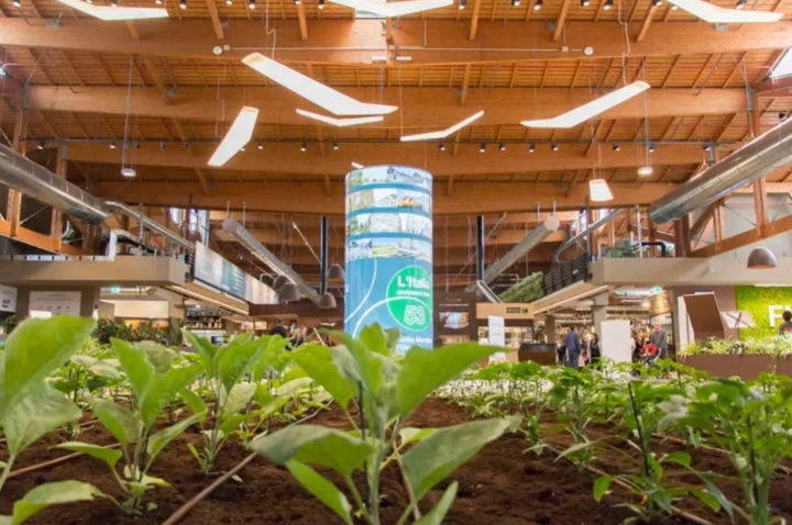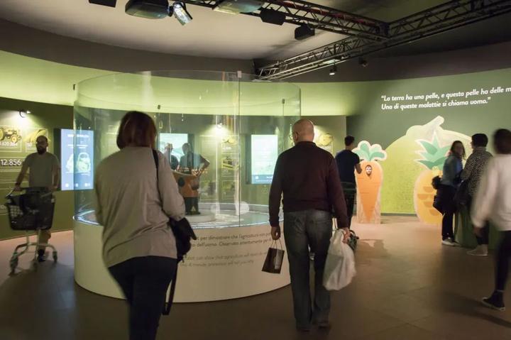 其中2万平米的露天农场分为牧场、家禽禽舍、果园和蔬菜园、葡萄园、橄榄园、松露花园、兔子园等多个主题,分散在主体建筑外围,包括种植区和养殖区,种植有2000多种农作物,养殖了200多种家禽和家畜,它们都是意大利本土的农业特产;