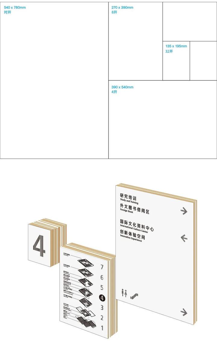 在标识尺寸设定上,我们以书籍开本规格为标准,根据标识信息内容的不同,将不同类型的标识制作成适合的开本大小。有的是单本、有的是几个不开本大小“书籍”的集合。室外标识因为尺度较大,信息量较多,标识模块以对开、4开为基数递增;室内标识尺寸则以对开、4开、8开和32开为主。标识开本尺寸越小,则越厚。例如尺寸最小的房间名称标识为为32开,厚度是10厘米,去模拟典籍的感受。